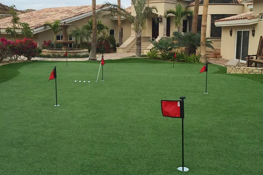Private Backyard Putting Green in artificial grass featuring red flags